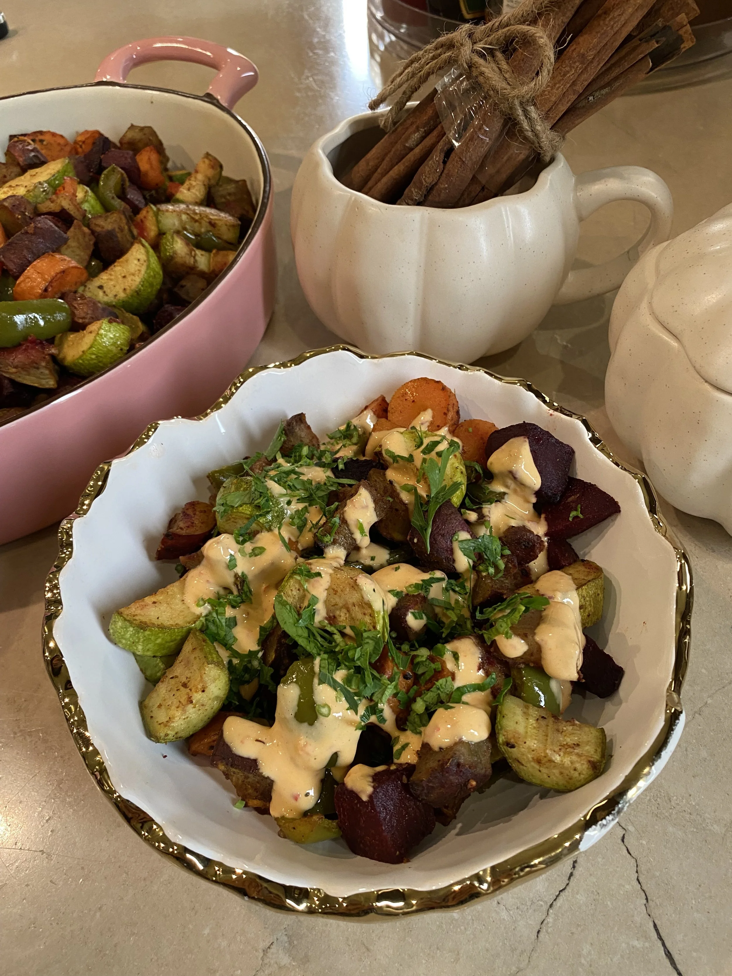 Once the vegetables come out of the oven, allow to cool for a few minutes before pouring over the tahini drizzle.